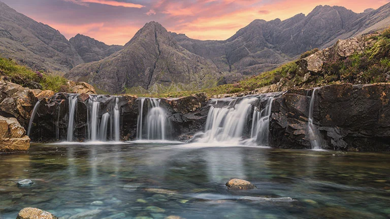 Located in the spectacular landscape of Glen Brittle, below the imposing Black Cuillin hills, the enchanting Fairy Pools are a secret treasure. This natural wonder is a series of crystal-clear, turquoise pools and cascading waterfalls draining from the River Brittle. It is said that these magical pools are where fairies bathe, and as you look at the pure mountain water tumbling down the rocks into the vividly coloured pools, it’s not difficult to see why this place is so magical.